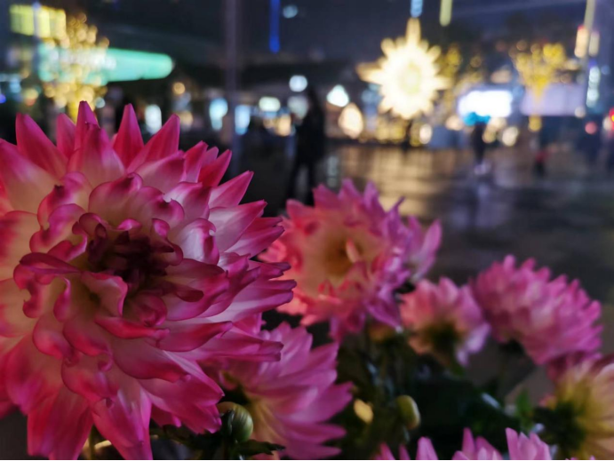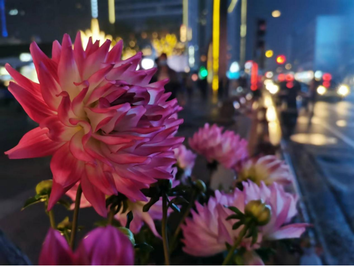 晚八点左右,我正在春熙路散步。今天天气突然转冷,街道上湿漉漉的,微风中透着一丝寒意。喜爱热闹的成都人,此刻出来逛街的很多。路边,忽然看到鲜艳无比的大丽菊,我驻足流连拍照。这靓丽的花朵为这微冷的空气平添了一份温暖。